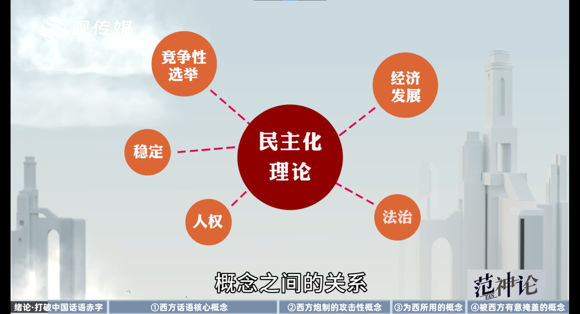 - 西方话语的核心概念:自由、法治、宪政、程序正义、产权、契约、个人主义、公民社会、三权分立、权力制衡、政治多元主义