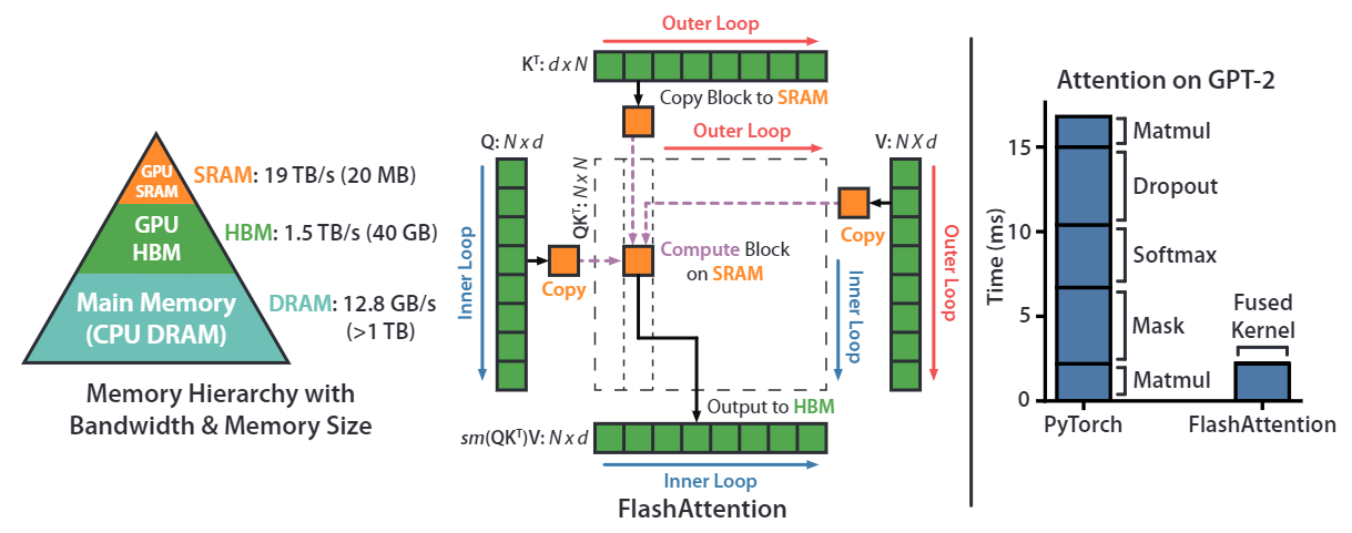 右图则展现了 Flash Attention 的优良性能,将原始的 GPT-2 Attention block 内的算子进行融合,极大地降低了计算和访存的时延。