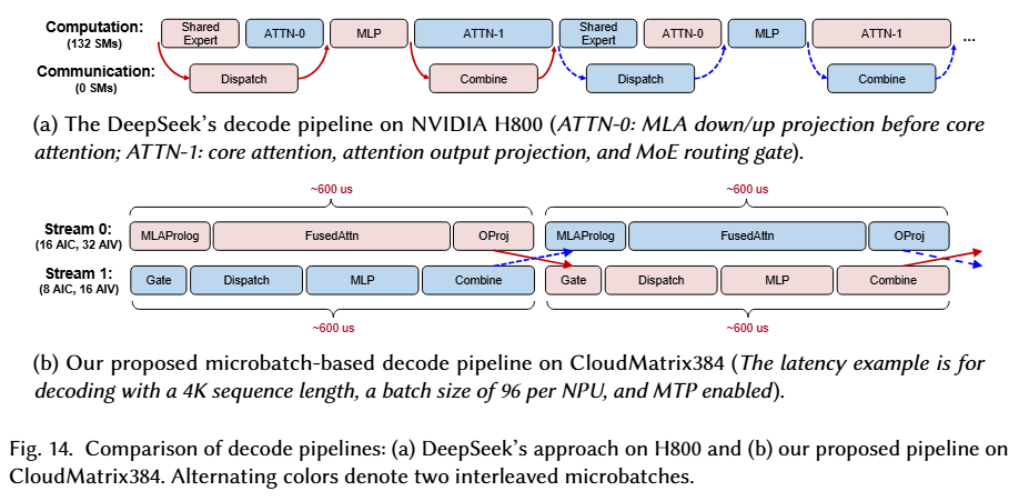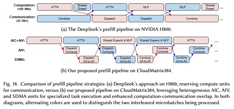 将 DeepSeek-V3 技术报告中提出的双微批次通算掩盖的策略直接应用到 CloudMatrix384 上会存在硬件架构不适配的问题。根据 CloudMatrix384 的特点,首先可以将低强度的辅助计算卸载到 AIV,使 AIC7 能够专注于计算密集型算子;其次,可以显式地路由大容量数据传输,特别是 MoE 的 A2A。【详见图 18b】