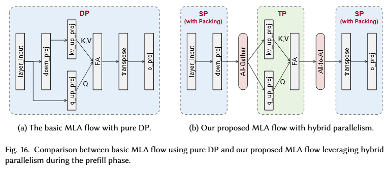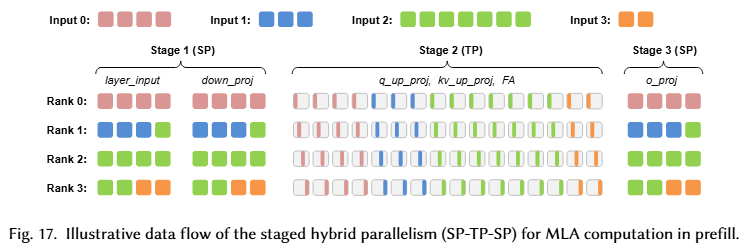 解决方案:分阶段混合并行策略。在 MLA block 内,计算 Attention 时采用 TP,前后则采用 SP。具体来说,SP 用到了序列打包:第一阶段的 down_proj 和第三阶段的 o_proj。