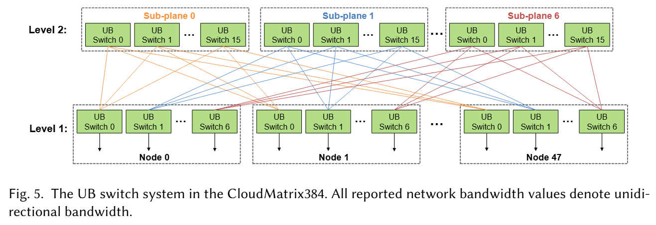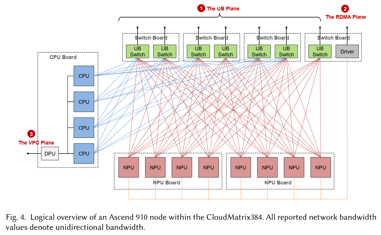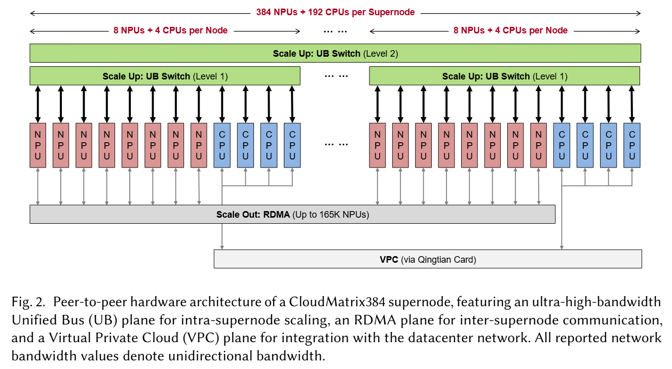 CloudMatrix384 是一种搭载了 384 个 Ascend 910 NPU 和 192 个 Kunpeng CPU 的超节点,每个节点配备 8 个 NPU 和 4 个 CPU。据此可推得一个超节点内共有 48 个节点。