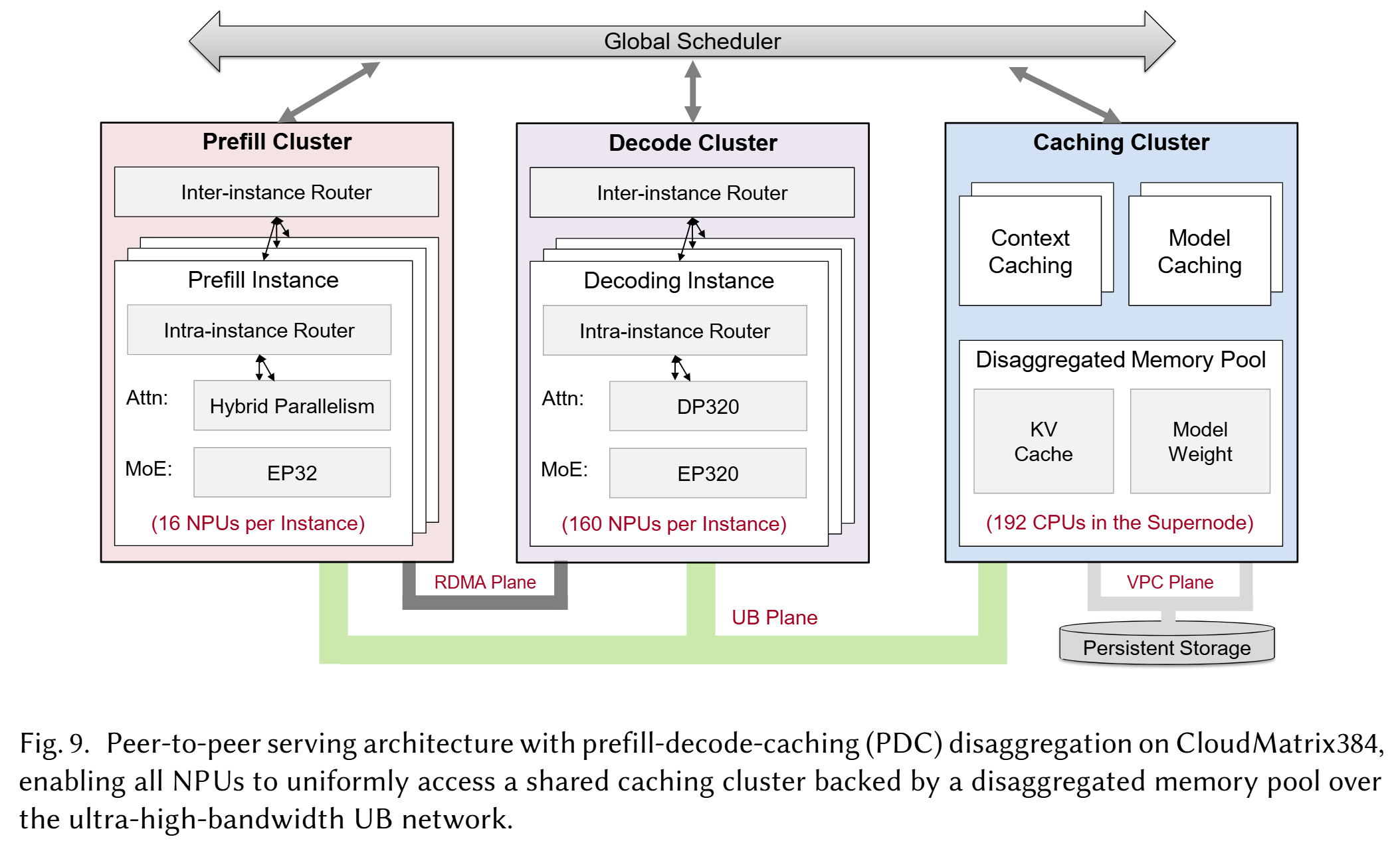 - RDMA 平面:支持跨超节点的 NPU 间通信,传输因 PDC 分离产生的 K/V 缓存