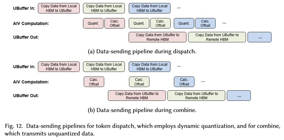 将 DeepSeek-V3 技术报告中提出的双微批次通算掩盖的策略直接应用到 CloudMatrix384 上会存在硬件架构不适配的问题。根据 CloudMatrix384 的特点,首先可以将低强度的辅助计算卸载到 AIV,使 AIC7 能够专注于计算密集型算子;其次,可以显式地路由大容量数据传输,特别是 MoE 的 A2A。【详见图 18b】