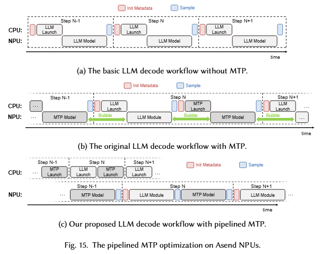 MTP(Multi-Token Prediction,多词元预测)的机制是每次推理出一个词元时,还会预测接下来的几个词元,然后在后续的生成中验证。尽管它能提高解码效率,但是其带来的挑战是频繁的 CPU-NPU 同步,这会导致流水线中断的问题。